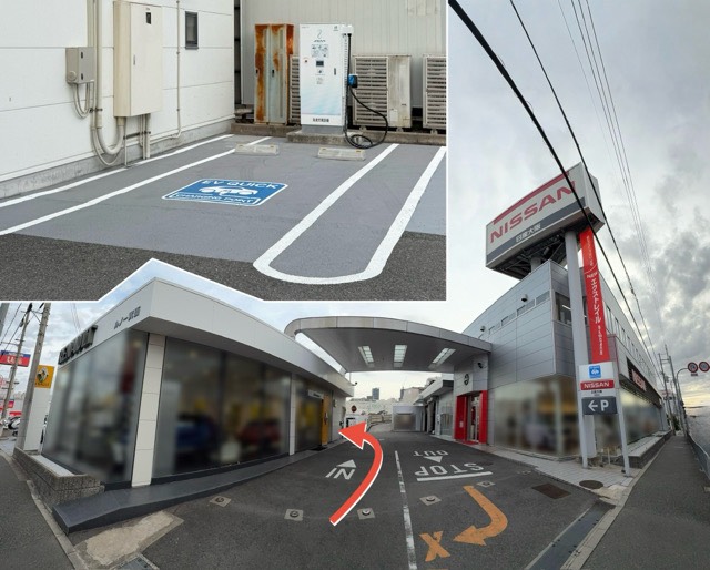 道路から見て、左側の道に入ってすぐ右側にあります。写真追加 店舗の敷地内からではなく、横の道から直で充電の車室に入るので気楽に充電に入れます。これはありがたいです。 この位置なら24時間だろうと思っていたのですが、早めに24時間稼働に変更を希望したいです。 待機場所みたいなのもあります。今となれば充電器も増えてきたので待たないでも次に行けば良いぐらいにはなっています。