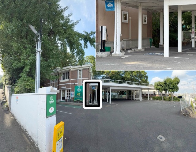 大阪中央環状線側道から建物北側の角にCHAdeMO充電設備が設置されています。 以前は最大60AだったCHAdeMO充電設備は、最大125A放電するニチコン製へ更新されています。