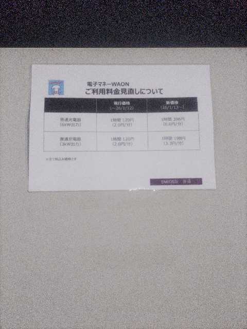 充電コントローラーの画面ですが、1月13日のWAON認証料金改定前のものなので変更があるかもしれません(AEON Pay等の決済に対応予定)。 1月13日以降WAON認証でご利用のかたは充電前に料金の確認も忘れずにお願いします。