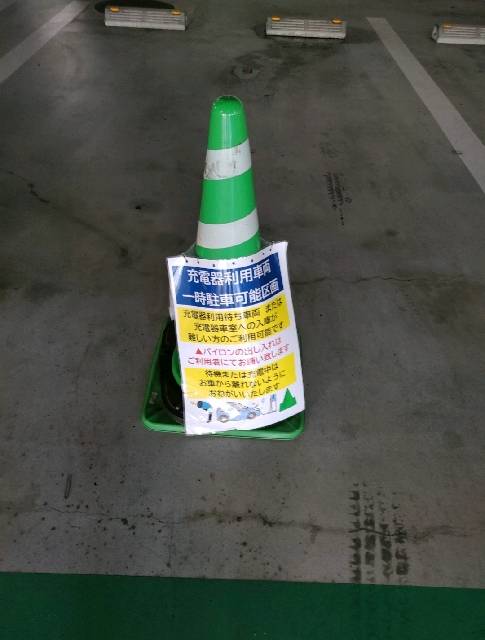 待機スペースのカラーコーンに付いている掲示物の文言が変更されていました。 充電器利用車両一時駐車可能区画 「充電待ち または 充電車室への入場が難しいかた」 「待機 または充電中はお車から離れないように」 ※パイロン(カラーコーン)の出し入れはご利用者にてお願いします 充電ケーブルの収納もですが、利用者のみなさまご協力お願いします。