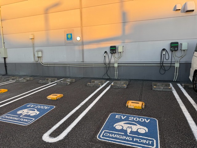 トヨタディーラーにある 普通充電器です。 写真のように EV 車以外が停まってることがありますので 店舗スタッフに声をかける必要があります。
