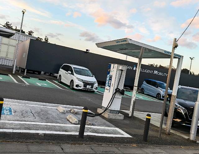 日産ディーラーに併設された 急速充電器です。 そばに ベイシアスーパーマーケットがあるので買い物のついでに充電できます。