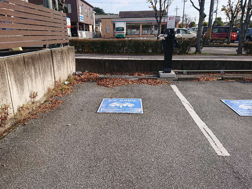 大通りから見て左側面の壁に設置されています。 充電器があることが目立つようにして、最後まで充電以外の車が止まりにくいようになっていて欲しいとは思いました。