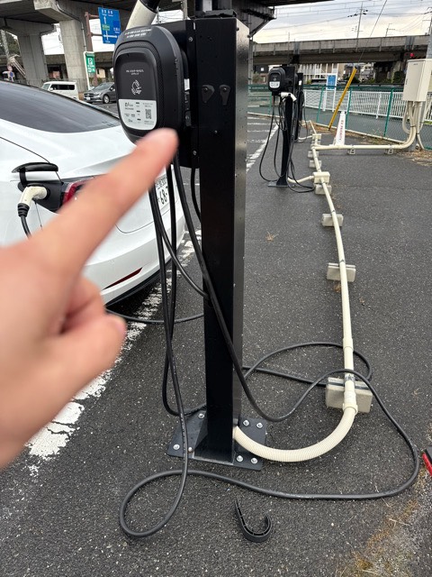 フレンドマートの隣の駐車場の奥(赤枠)にあります。 テスラの充電器は見た目もおしゃれでつなげるだけで充電でき、しかもコーンなどをのけなくてもそのまま充電できる、とても良い充電体験ができるので素晴らしいと思います。 私も次に車を選ぶときはNACS搭載は必須条件になっています。
