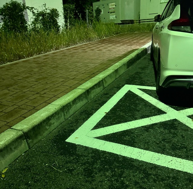 駐車場のレイアウト的に使えるのは1台のみ、手前の車が奥まで入れてないと停められ無いかも? 折角3台も充電器が有るのに勿体無い!