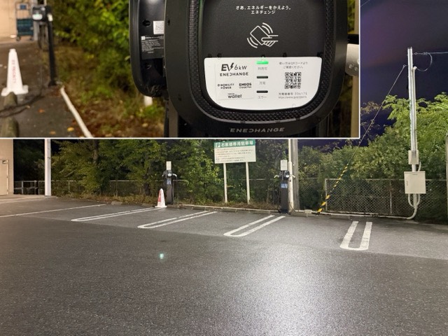 敷地に入って、右側の屋根の下に2つ左の緑の壁のところに2つあります。 間隔を開けて設置されてるので、充電できる写真は多いと思いますが、コーンの1つか2つは置いてほしいと感じました。
