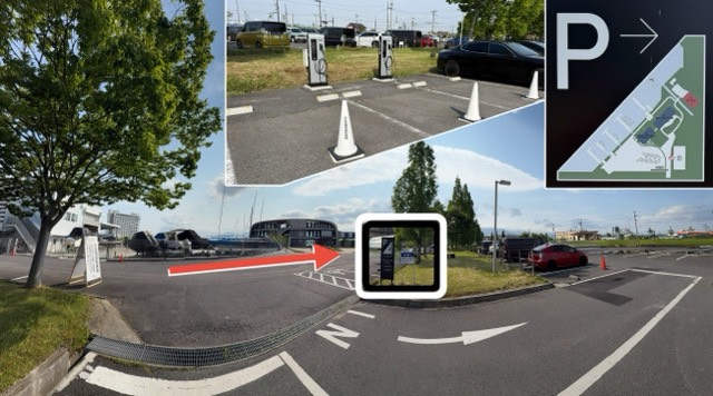 敷地に入って左側にあります。 EV充電のために、絶対に空けておいてとはいえませんが、他に空きがある限りは充電以外の車が止まりにくいような仕組みには期待したいです。