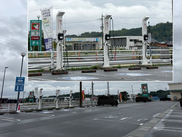 EV用CHAdeMO充電設備は、国道1号線(亀山行)から敷地に入って左前方に設置されています。 設置されているのは、最大125A放電するニチコン製です。