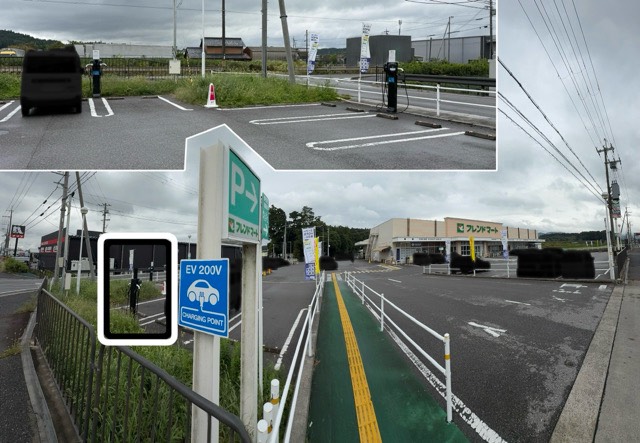 建物の真ん中にあるフレンドマートの出っ張りの左側にあります。 ここには訪れたときはが4台中3台が非充電車で右端のコーンで守られているところだけが空いていました。写真を撮るまでに左の1台が空きました。 まだ使用率が低いかもしれないので、これでもいいかな、とは思いますが、コーン2つぐらいの方が安心感があります。
