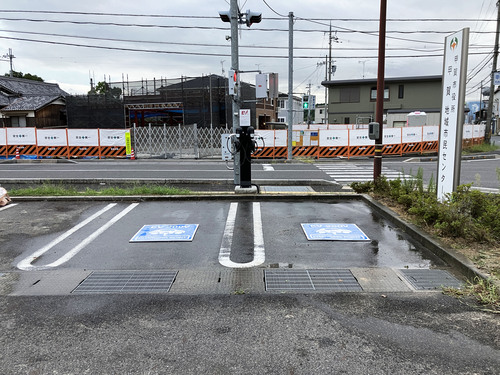 信号のある交差点「竜法師」から見て左側(北)の道路寄りに充電器が移動しています。 通りがかってみると、充電器のあった場所に、いきなり建物が立っていて驚いて立ち寄りました。 もう少し周りの建物が写っている写真が撮りたかったのですが…