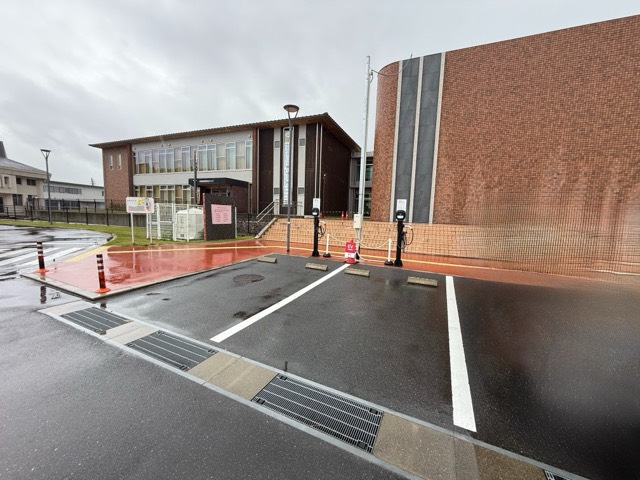 道路から見て、右側の立派な建物二棟の間の前面にあります。 充電器番号は左から若い順です。