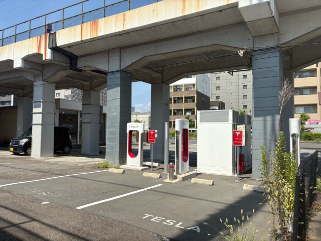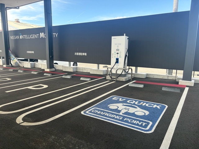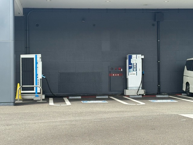 写真右手(中央マス)が100kw、左が50kwです。さらに右には普通充電があります。綺麗な店舗で駐車場も広いです。店舗お休みでも利用可能です。