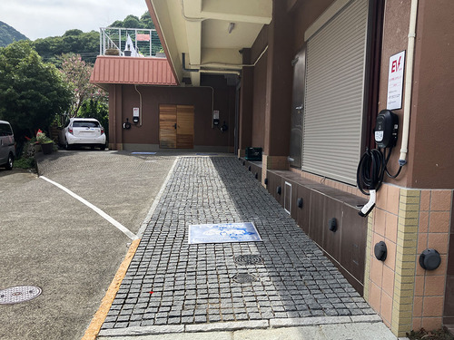 ホテル入口向かいの駐車場、奥から6台分設置されています。 事前に充電希望を伝えておくとスペース確保していただけます。