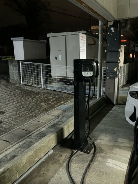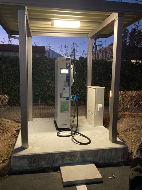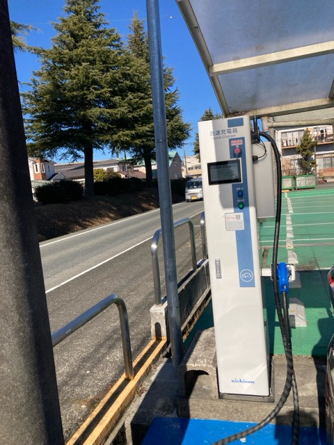 ニチコン製20kW器です。ゲート出口近くに設置されてます。バッテリーの大きいEVは違う充電器で充電した方が効率は良いかと考えます。