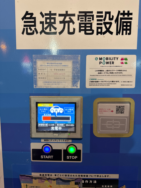 東光高岳製50kw急速充電器が駐車場入り口付近に設置されていました。新しい機械に更新されたようですが、転回スペースがあまりなく駐車は大変そうです。e-Mobility Power系カードまたエコQ電認証の場合は30円/分〜利用できます。店舗休業日でも使用できそうです。