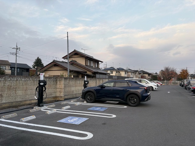 問題なく充電できました。充電器の保護のためだと思いますが、車止めがずいぶん手前にあるので駐車枠から車がはみ出してしまいますので、注意が必要です。
