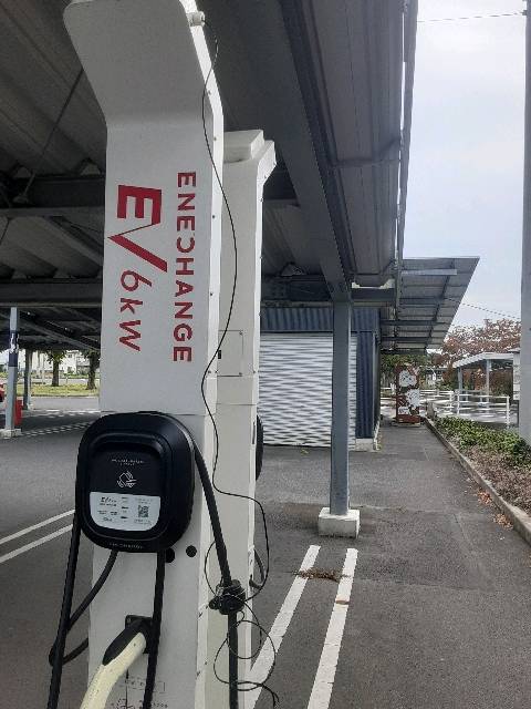 6kw普通充電器が施設裏側駐車場に4台設置されていました。エネチェンジ様が設置されている充電器は、エネチェンジアプリやempカード、ENEOS charge Plus等様々な認証方法があり、便利ですね!ただ、充電器に行くまでの道が車一台分の道幅しかないので、通行の際は注意が必要だと思いました。