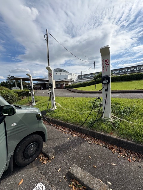 設置場所:入り口より道なりに進み、ロータリー手前の右側の車室にEV充電器があります。 どなたでもご利用いただけます。 最大出力6kW