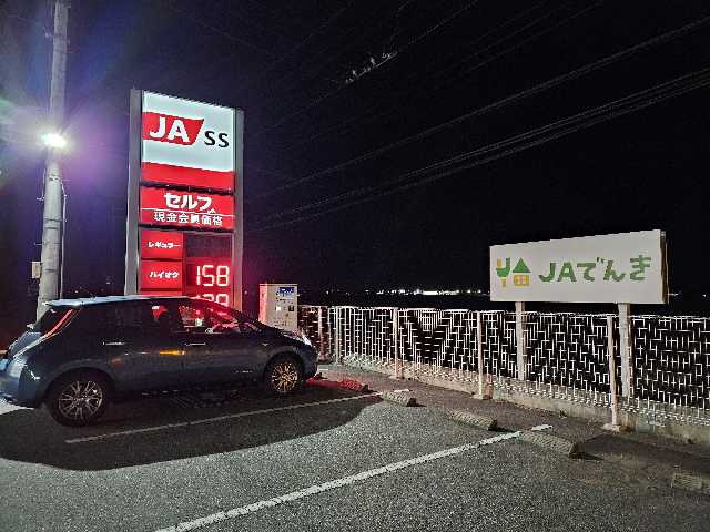 ガソリンスタンドの端っこ、コインランドリーの隣にあります。ファミリーマートが隣接していますので便利です。 1kwあたり50円でした。時間ではなく量で課金してくれる方が受け入れの遅いクルマには有利なので有り難いです!