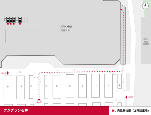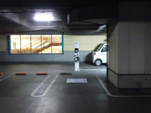 フジグラン石井の立体駐車場に2基+写真左側に無料の普通充電器が1基あるので合計3基あります