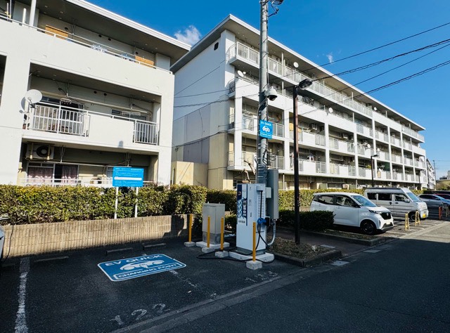 日東工業(株)製200Vコンセントです。5号棟西側コインパーキングの精算機近くの駐車枠に設置されてます。充電ケーブルは必要です。充電無料ですが駐車料金は有料(24h最大600円)です。