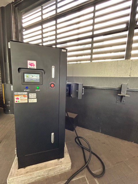 JFEテクノス製50kw急速充電器が設置されていました。e-Mobility Power系カードからのみで、エコQ電認証では利用できず、営業時間内のみ使用できます。なお蓄電池式のためか、実測では40kw近辺がmax出力のようで50kwは出力されないようです。また30分の充電終了後、数分クーリングタイムのようなものがあり、充電終了後直後の充電はできない表示がありました。