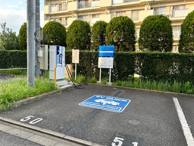 (株)東光高岳製50kW器です。団地に入り、目の前の駐車場に充電器は設置されてますが、直進進入禁止なので左回りで充電器前まで行きます。3号棟北側に設置されてます。