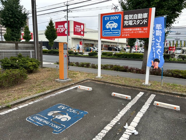 Panasonic製4kw普通充電器がオートバックス駐車場南西角に設置されていました。e-Mobility Power系カードなどの認証はなく、利用の際はレジカウンターで受付をする必要があるようです。