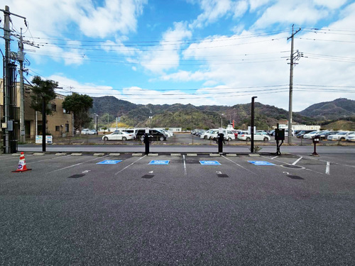 3台分の駐車スペースが確保されていますが、コーンは2個、EV充電マークが駐車スペースにないので、休日の繁盛期には停めれるか心配です。