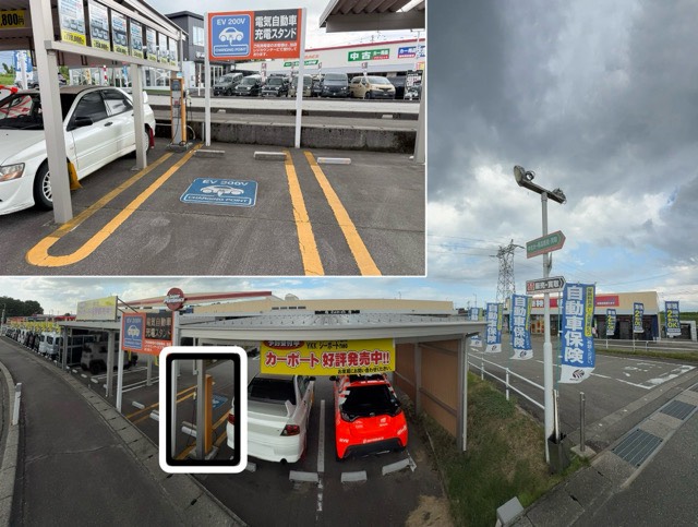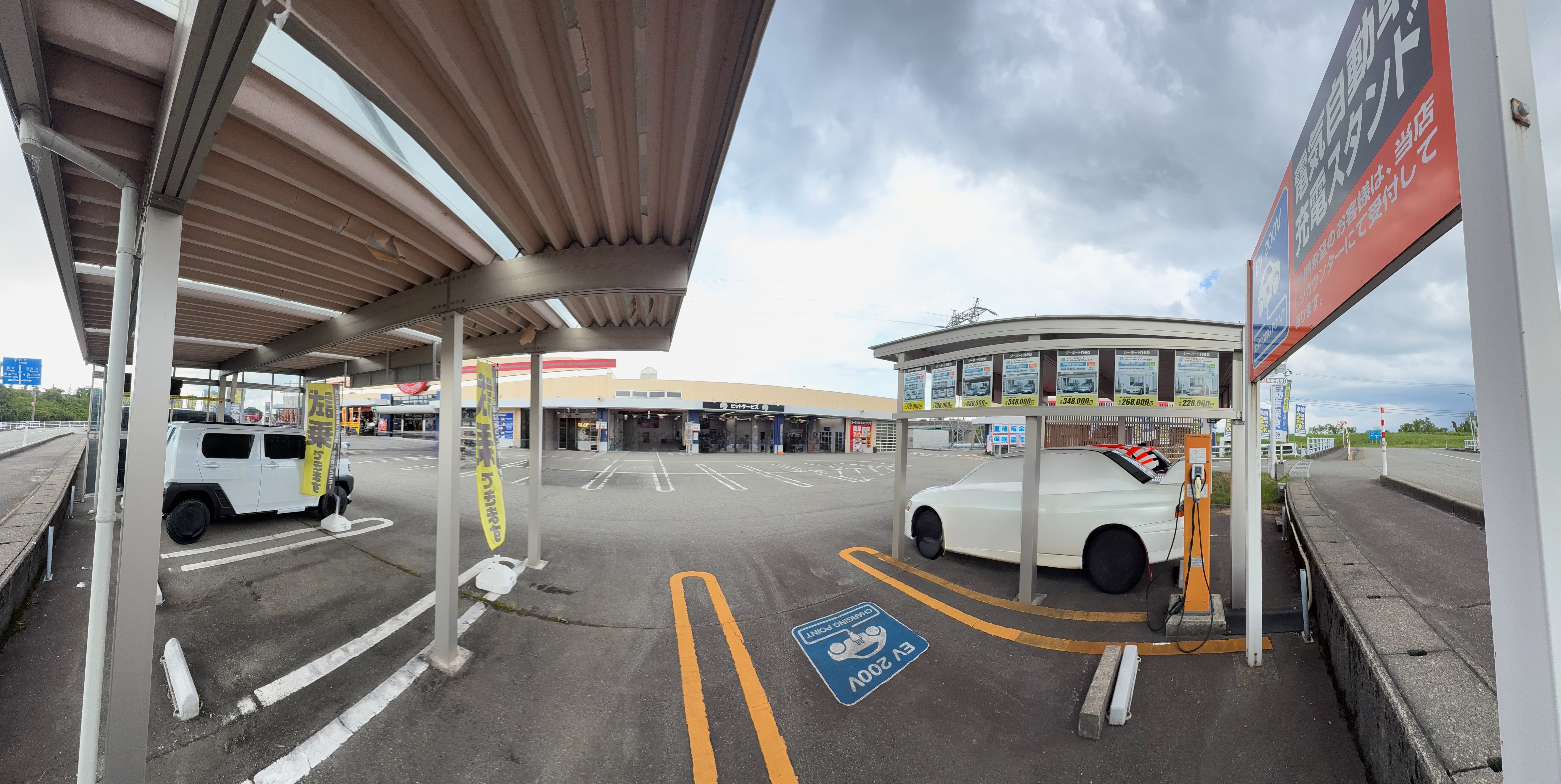 ピット寄りの前、道路寄りの屋根付き駐車場の間にあります。文書と写真追加 更新するならばいろんな支払いができる「エネチェンジ」の充電器を屋根のあるところに数台置いてほしいと思います。 ここだけではなく全国各地にあるスーパーオートバックスに期待したいです。