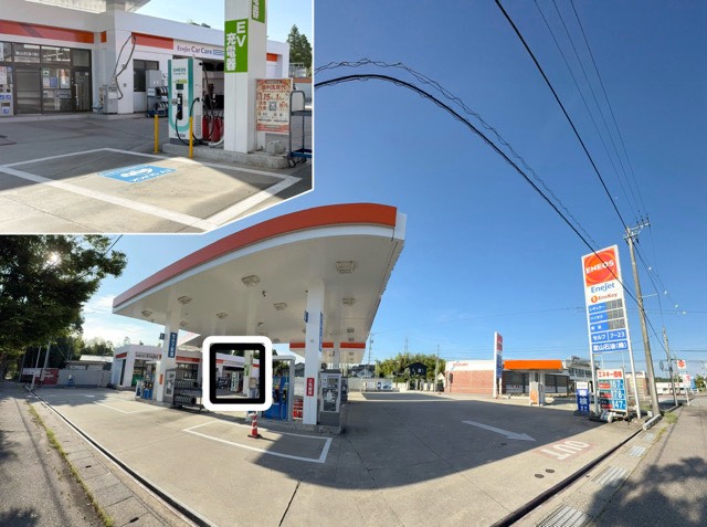 ニチコン50kWがENEOS敷地中央、店舗建物の正面付近にあります。 壁際ばかり探してたので見つからず、店員さんに教えてもらいました。