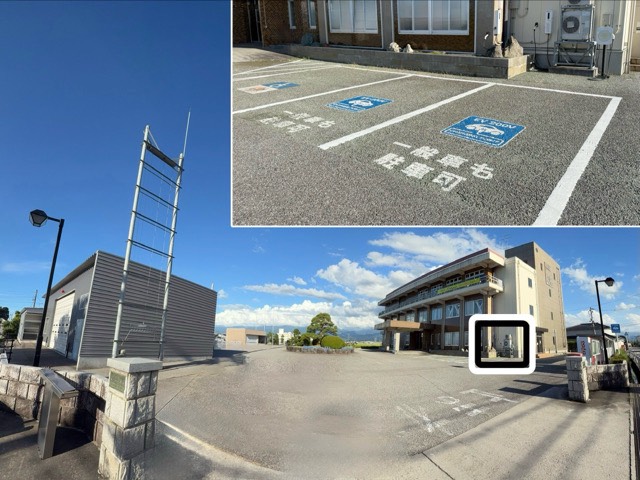 看板のある出入り口のすぐ前の建物前にあります。写真追加 ひとつの枠に2台設置されており、どのように駐車すれば2台目も使いやすいのか、考えないと困るかもしれません。テラチャージの充電器はもっとわかりやすくなったほうが良いかと思います。 「一般車も駐車可」の書き方も満車時などでは間違ってないかもしれませんが、満車になるまでは空いていてほしいので、「EV優先」と書かれたほうがよいとおもいます。