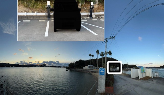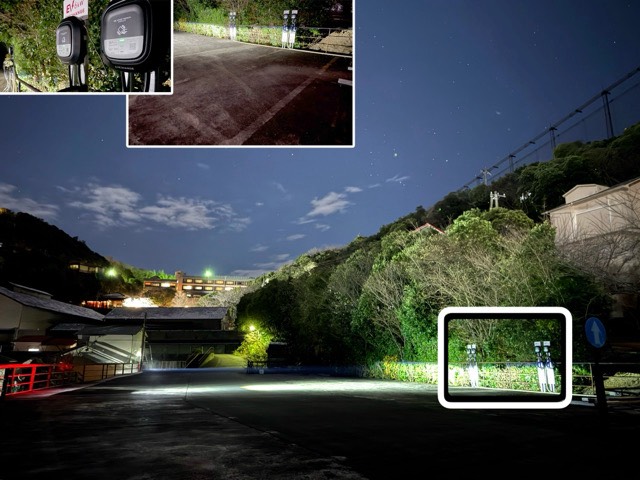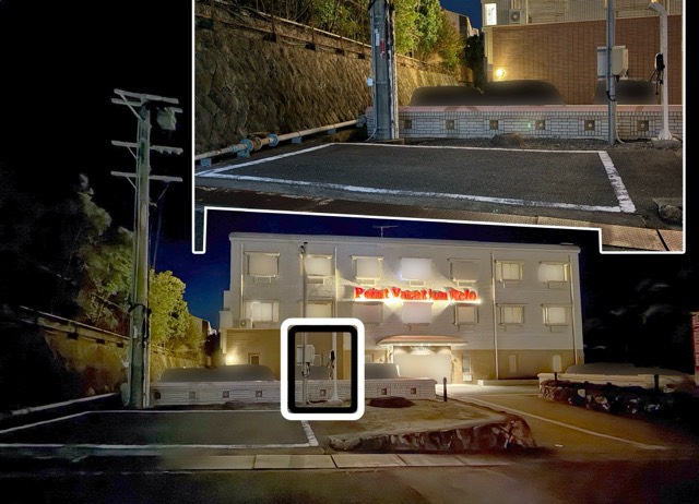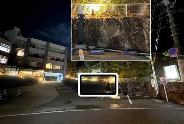 敷地に入ってすぐ左にあります。文書と写真追加 この時は充電されている方がいて、真ん中の間隔が空いている車室を使っておられました。 このように感覚が空いている設置方法は充電可能車室が増えて、万が一非充電車が止まっていても使える可能性が少しでも増えます。 とはいえ宿泊施設ではコーンで守る必要もあるとは思います。予約時にEVだと伝えておくとその数のコーンを置いてもらえるなどあれば安心感が増します。