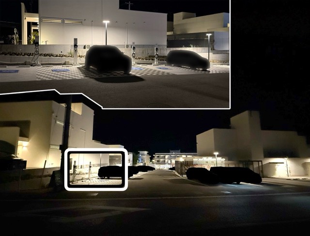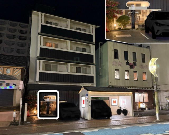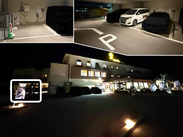 ホテル入り口に向かって左手に2機設置されてました。駐車スペースは3台分あり、ガソリン車が止まっていても1台は余裕があります。