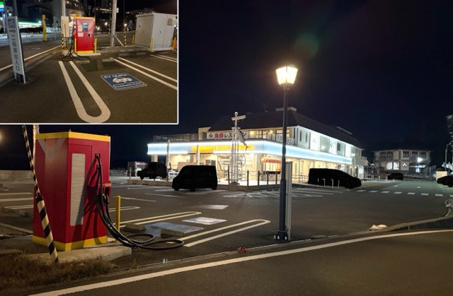 道路から見えているのでわかりますいです。写真改訂 ここのFLASHは近くにファミリーマートもあり便利なところだと思います。FLASHの設置場所にはあまりトイレやお店などがないところが多いと感じられるので、コンビニが近くにあるようなところは素晴らしいと思います。 「観光地に急速充電かぁ」と思うこともありますが、周りには目的地充電でエネチェンジなども豊富にあり選択肢があるのはやはり良いことだと思います。 FLASHの次のバージョンはケーブルの取り周りの良さに期待したいです。