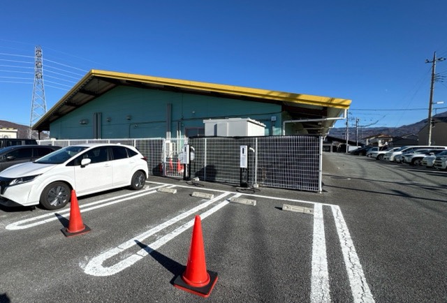 TerraCharge認証日東工業(株)製6kW充電器×2器です。アプリ操作で充電します。店舗建物西側に設置されてます。